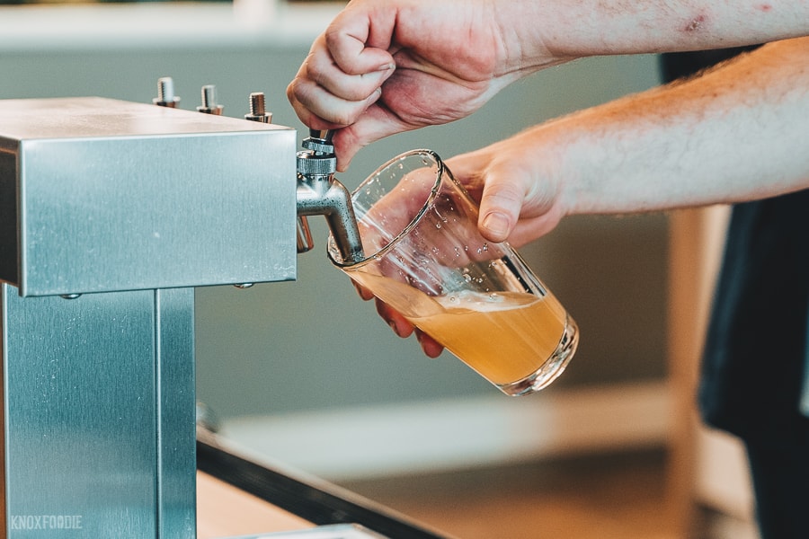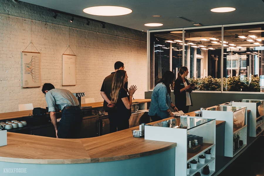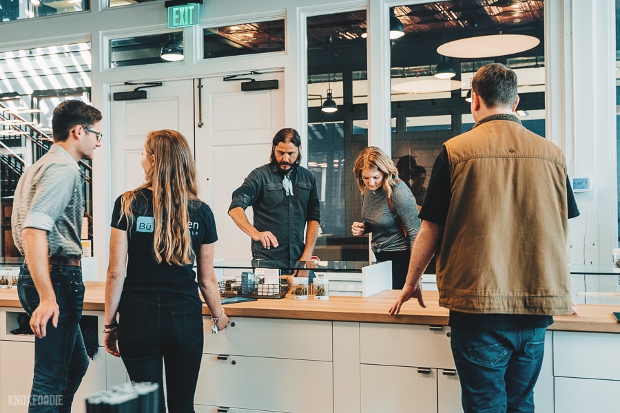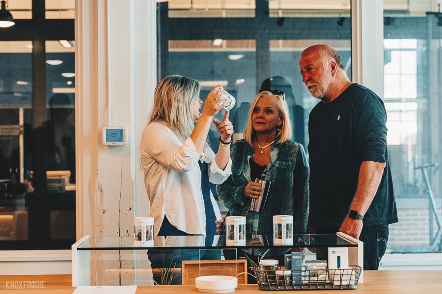 We got a sneak peek at the new Old City retail location this evening and there’s lots of great things in store for visitors. The sleek new space designed by Sanders Pace architecture is your first indication that this is not just another Old City business. More like an upscale jewelry store with exquisite style, the entry area features a counter space where guests can browse and ask questions about their CBD ( and CBG ) products ranging from canisters of buds with microscopes on the top that you can view the hemp up close and personally, to rolled buds, to vapes and gel tablets. The opening lineup of products vary in potentency and effects and Casey Brooks took us on our tour explaining the individual products in details along with showing us retail pricing. Also in the front area is a beverage area featuring hemp infused beer from Elkmont Exchange, Frog Juice Kombucha, and other selections. We sampled the Hemp Beer and it was delicious and refreshing and dank in the best way.